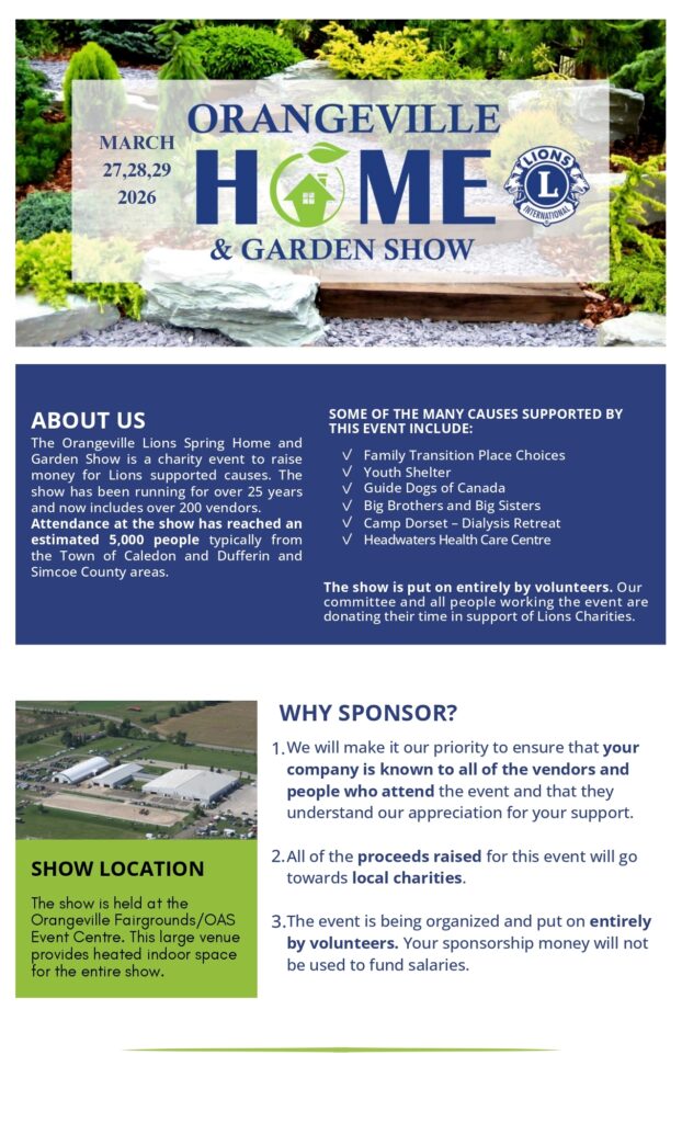 The Lions welcome you and thank you for your support of the local businesses represented at this event. All proceeds from the show enable the Orangeville Lions Club to continue their funding of important causes in our local community. Please drop by the Lions Club booth (E73) just to say hi or to get information about becoming a Lion.